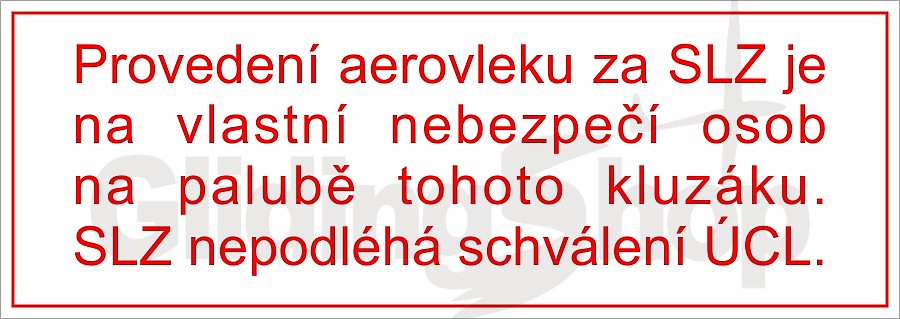5.2.11 Při každém letu ve vleku za ULL musí být kluzák vybaven štítkem umístěným na místě viditelném pro každou osobu na palubě kluzáku s jasně čitelným textem: „Provedení aerovleku za SLZ je na vlastní nebezpečí osob na palubě tohoto kluzáku. SLZ nepodléhá schválení ÚCL.“